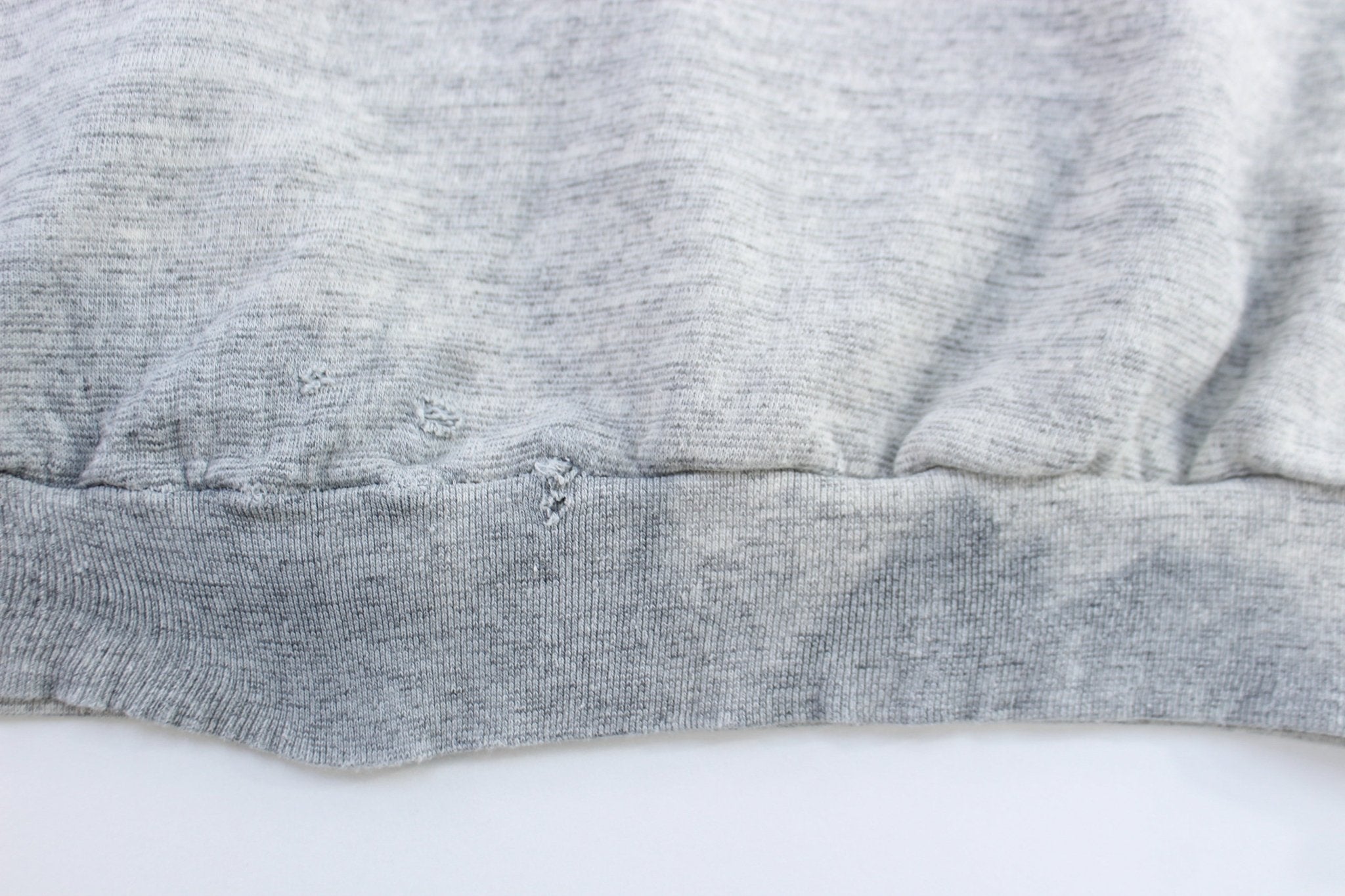 Distressing on hem seam & color bleeding stain on front.